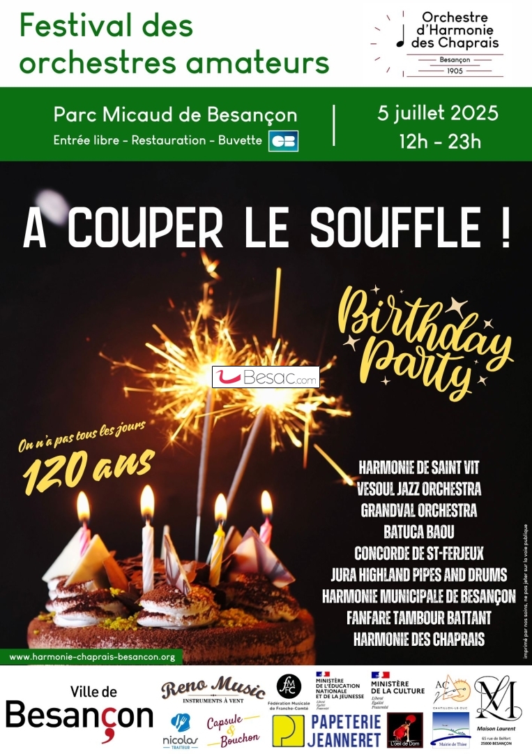 Pour l'occasion, notre association réunit 9 formations musicales de différents styles (orchestres d'harmonie, banda, batucada, pipe band ou big band), toutes composées de musiciens amateurs, pour plus de 10h de concerts le samedi 5 juillet au Parc Micaud de Besançon