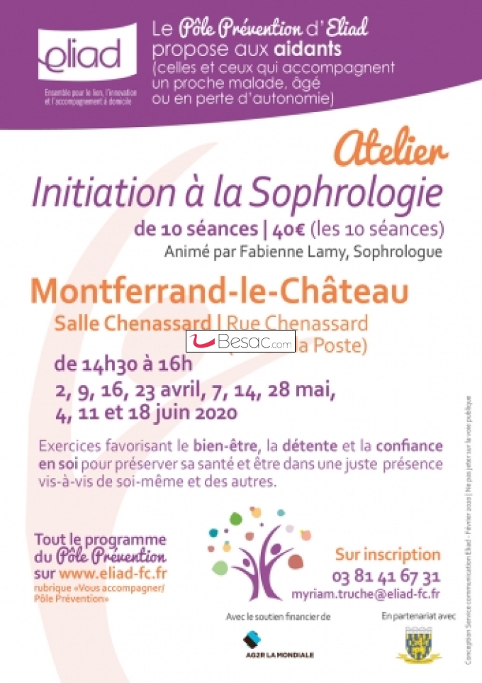 Le Pôle Prévention d’Eliad propose un atelier d’initiation à la Sophrologie à Montferrand-le-Château les 2, 9, 16, 23 avril, 7, 14, 28 mai, 4, 11 et 18 juin 2020 de 14h30 à 16h.