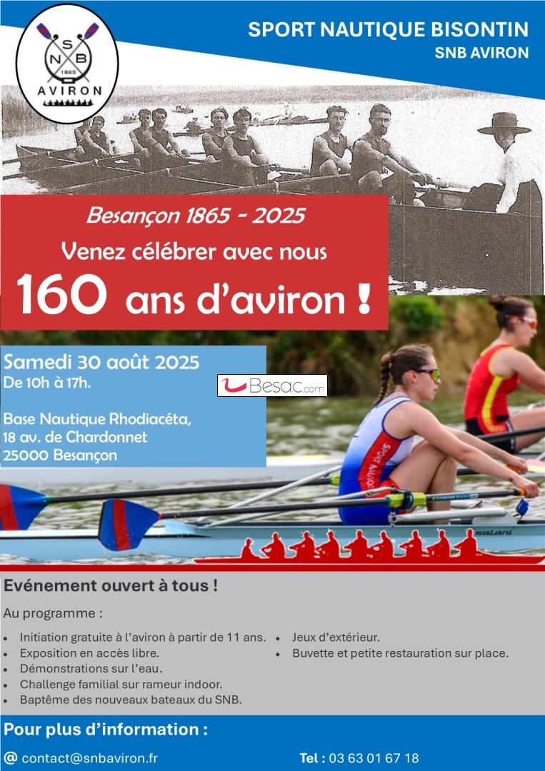 Cette journée est ouverte à tous : que vous soyez d'anciens rameurs du club, des férus d'histoire de notre ville, ou juste désireux de venir tester ce sport assez unique, venez célébrer avec nous 160 ans d'aviron à Besançon, le samedi 30 aout 2025 !