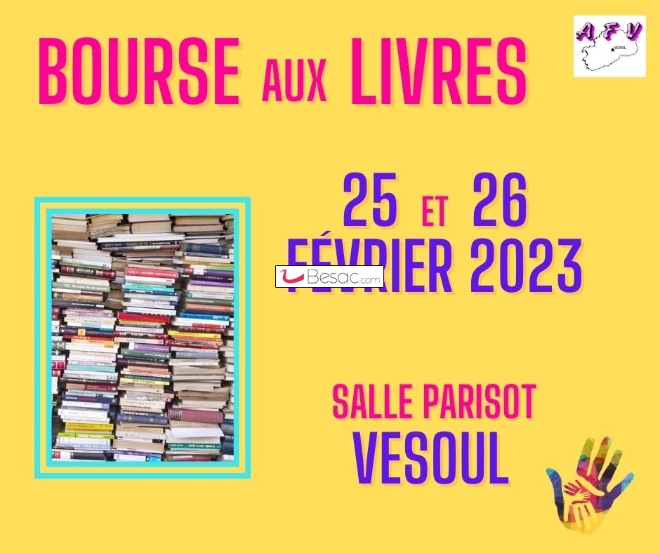 Marchés, Vide-greniersL’Association Familiale de Vesoul organise les 25 et 26 février 2023 sa traditionnelle BOURSE AUX LIVRES – à VESOUL – salle PARISOT.