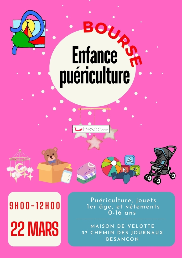 Marchés, Vide-greniersLa Maison de Velotte, 37 chemin des Journaux à Besançon, organise samedi 22 mars 2025 de 09H00 à 12H00 sa traditionnelle "Bourse Petite Enfance" de printemps.