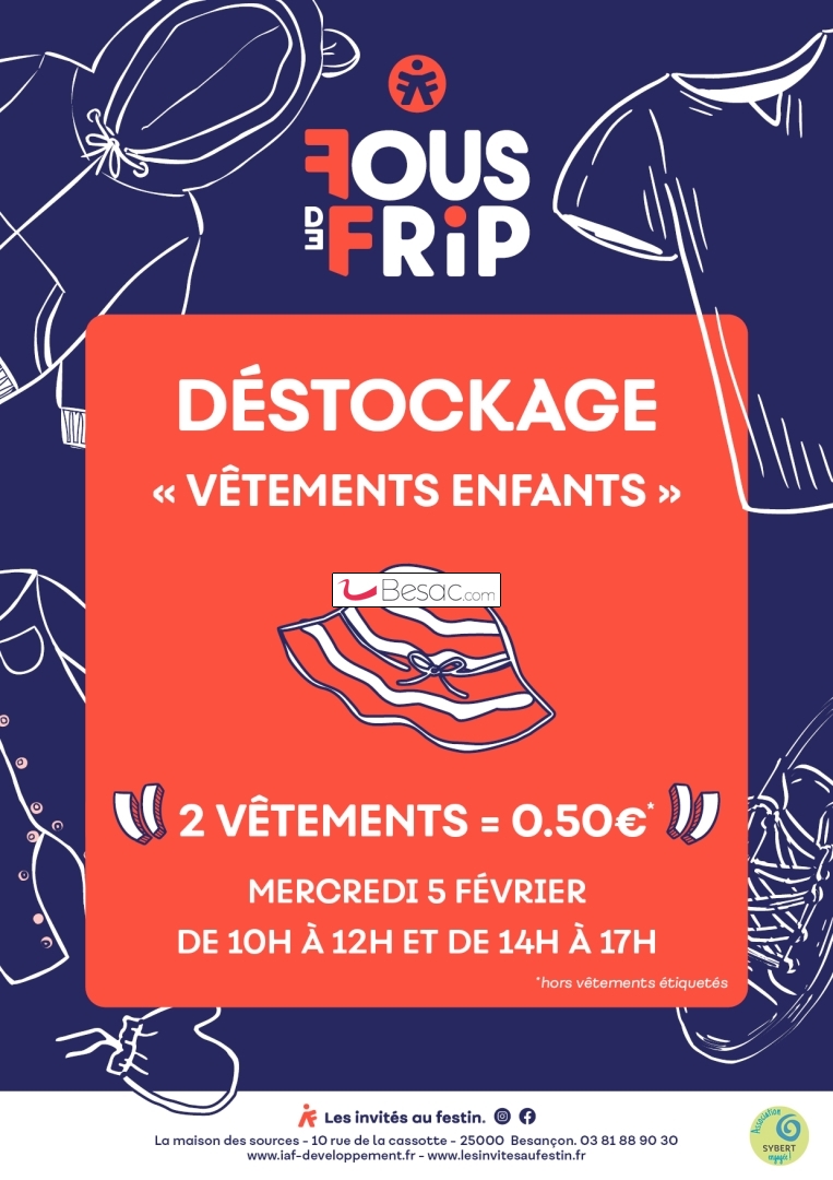 Marchés, Vide-greniersLa friperie des Invités au Festin « FOUS DE FRIP » organise un grand déstockage de vêtements enfants dans la salle Arc-en-Ciel.