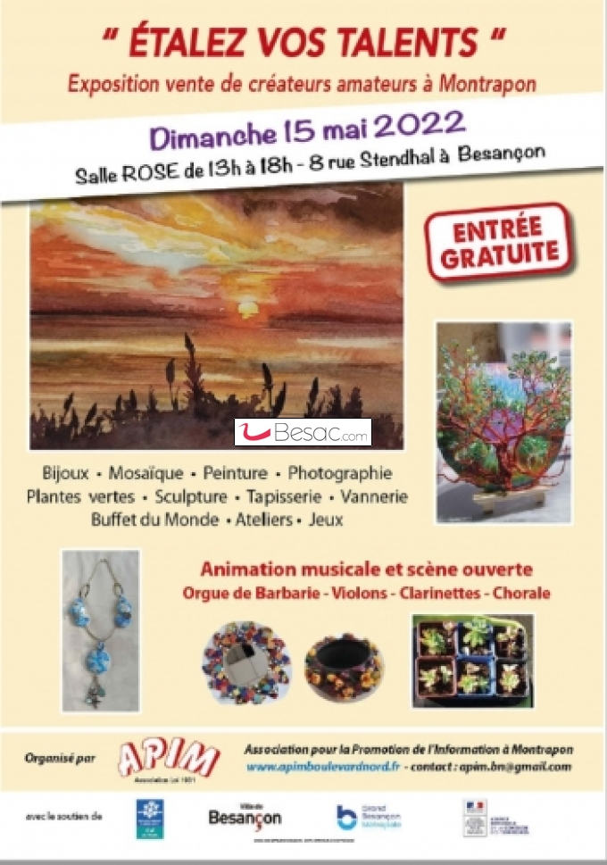 22 exposants seront présents pour une exposition - vente d’objets, œuvres, artisanat, créations, réalisés par des amateurs particuliers ou associations, résidant dans les quartiers de Montrapon, Fontaine Écu, Montjoux, Montboucons, Tilleroyes (pas de professionnels) ou du grand Besançon.