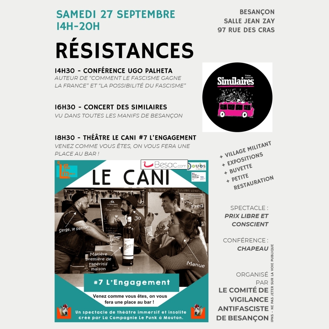- 18h30 : Théâtre : le Cani #7 L’Engagement, par la compagnie le Punk à Mouton+ Village militant, expositions, buvette, petite restauration