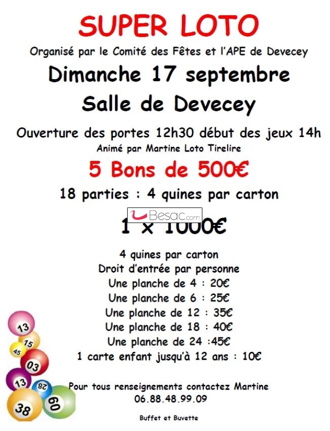 Marchés, Vide-greniersLe 17 septembre 2023, le comité des fêtes de Devecey et l’APE organisent un grand loto