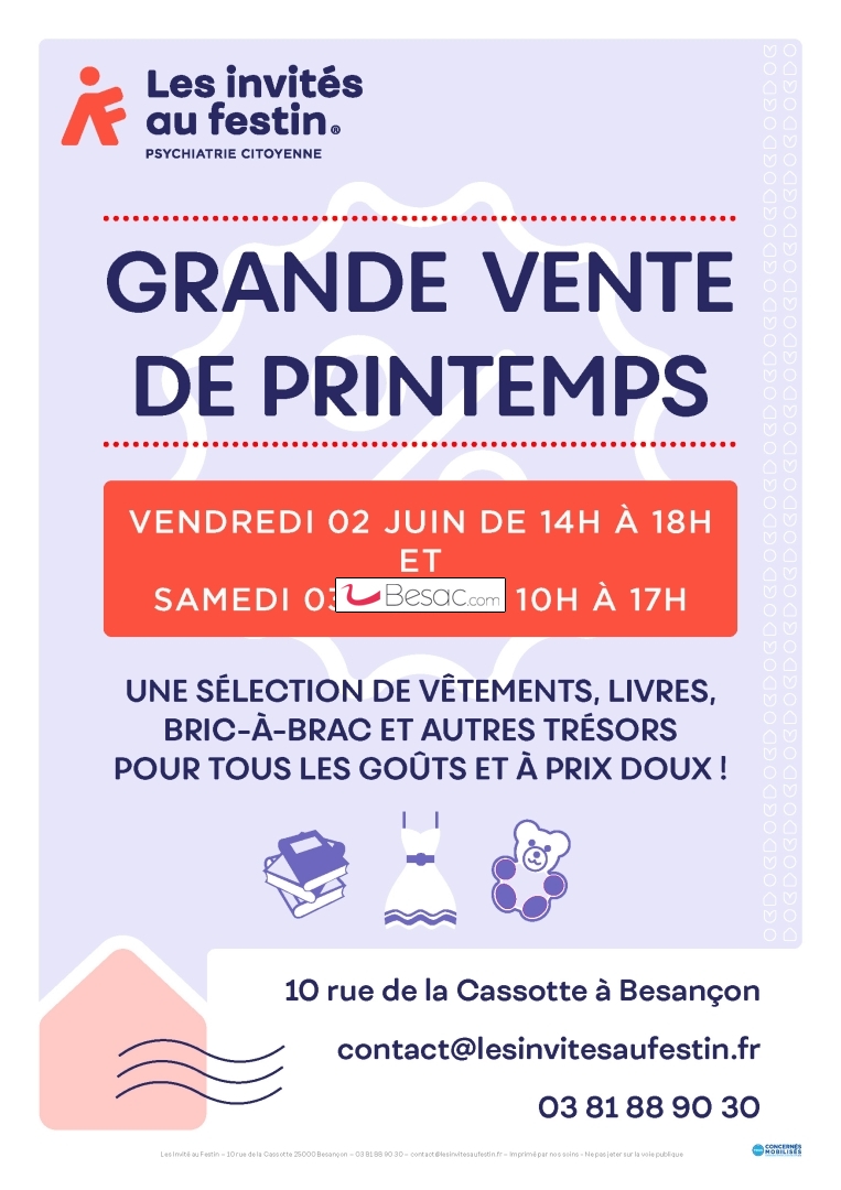 Nous vous attendons nombreux les vendredi 2 juin de 14h à 18h et samedi 3 juin de 10h à 17h00 à la Boutique des Invités au Festin, dans le cloitre de la Maison des Sources et dans notre grande salle « Arc-en-ciel » situés 10 rue de la Cassotte à Besançon.