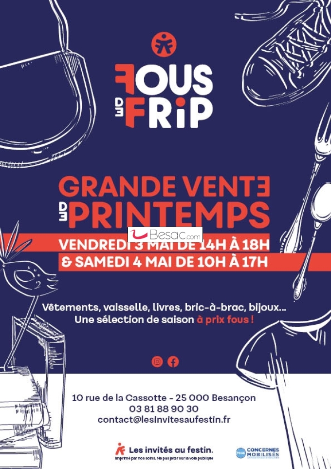 La friperie bric-à-brac des Invités au Festin « FOUS DE FRIP » s’expose dans le cloitre de la maison des Sources pour vous proposer un plus grand nombre d’articles : Vêtements homme, femme, enfant, vaisselle, bric-à-brac, livres, bijoux… une sélection de saison … à prix fous à venir chiner au 10 rue de la Cassotte !