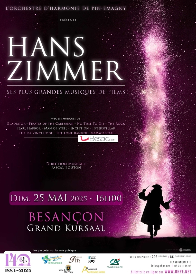 Les 55 musiciens de l’Orchestre d’Harmonie de Pin-Emagny et leur chef Pascal Bouton vous proposent une immersion dans le monde passionnant de Hans Zimmer pour vous faire vivre, le temps d’une soirée, un moment intense et exceptionnel aux sons de vos musiques de films préférées : Pearl Harbor, Gladiator, The Rock, Inception, Interstellar, Pirates des Caraïbes, …et bien d’autres …