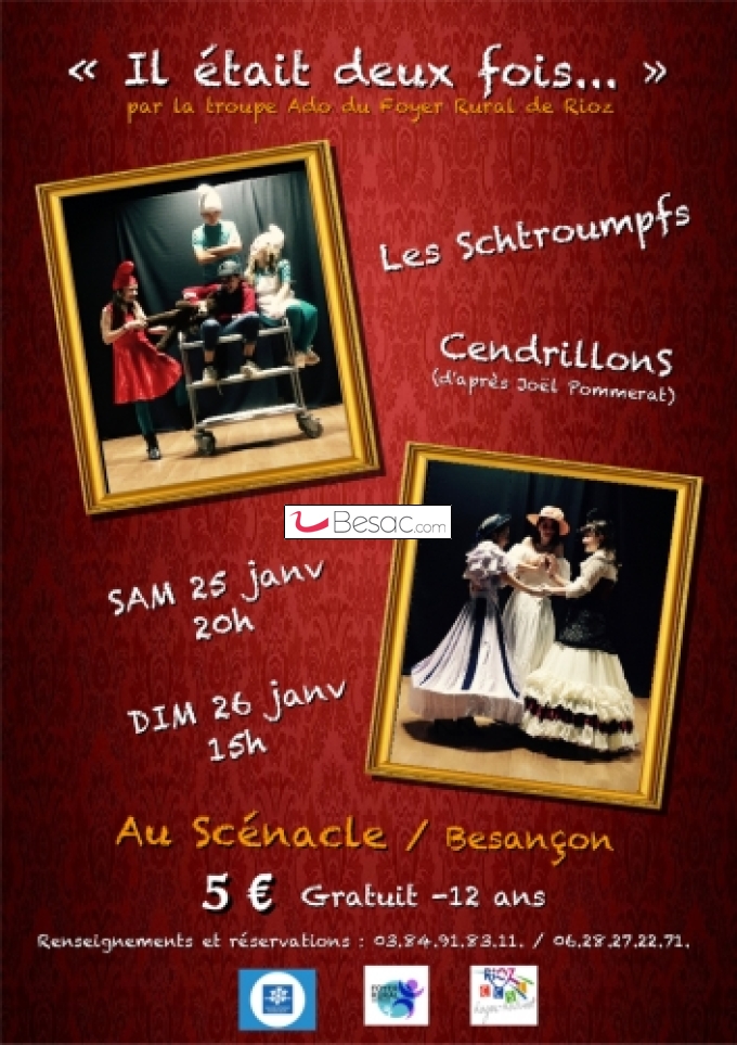 Un enfant terrible débarque chez les Schtroumpfs quand deux jeunes filles qui viennent de perdre leur maman découvrent leur belle-mère et ses deux filles... Deux histoires qui ont bercé notre enfance, et que les jeunes comédiens du Foyer Rural de Rioz revisitent avec un regard moderne, ludique, drôle, et touchant.