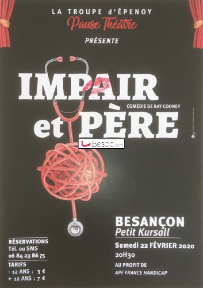 La Compagnie Pause Théâtre vous présente Impair et Père, de Ray Cooney, un vrai vaudeville ! Au sommet de sa carrière de chirurgien, le docteur Pierre Jouffroy s'apprête à faire un discours magistral devant 300 médecins venus du monde entier. C’est ce moment que choisi son prétendu fils pour faire irruption dans sa vie…Des dialogues de plus en plus fol-dingues, des mensonges qui mènent à des situations inextricables et burlesques, bref tous les ingrédients pour passer une bonne soirée !