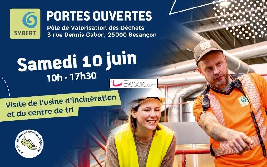 Le samedi 10 juin 2023, le SYBERT (Syndicat mixte de Besançon Et de sa Région pour le Traitement des déchets) vous ouvre grand ses portes au Pôle de Valorisation des Déchets, situé au 3 rue Dennis Gabor à Besançon, pour un événement festif et familial.