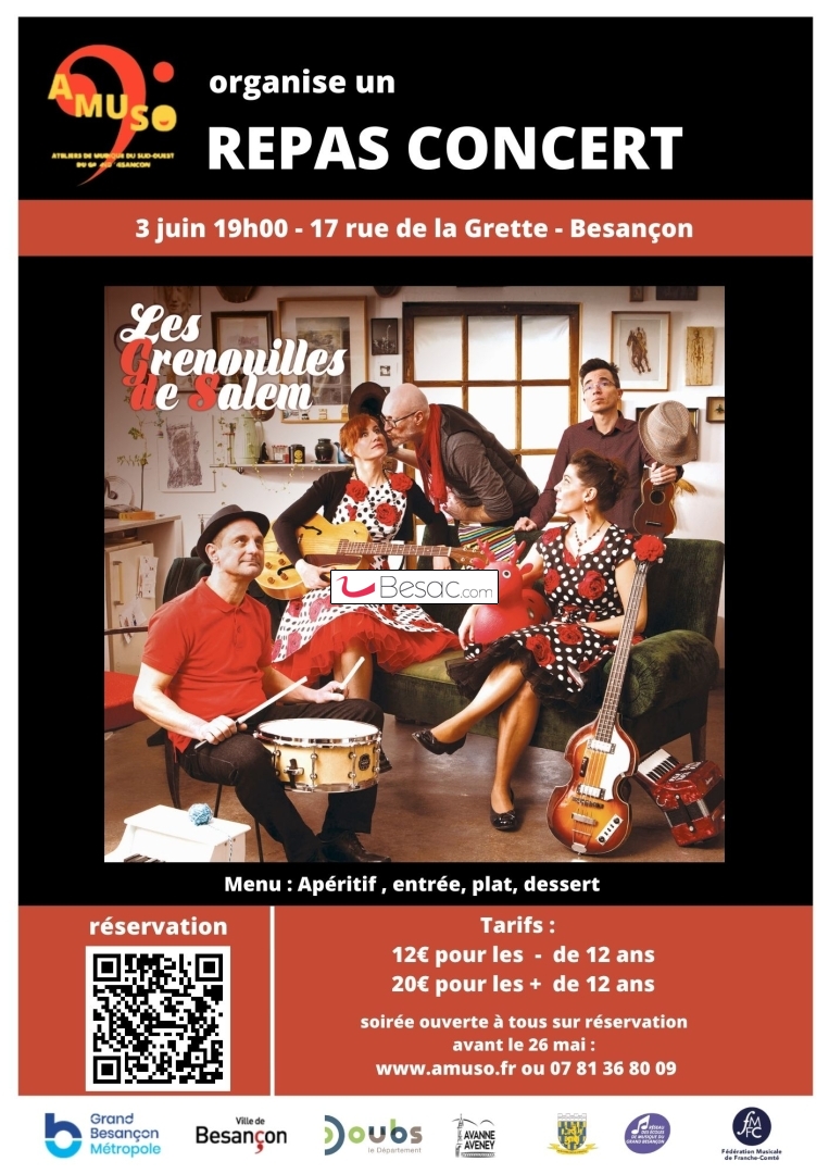 Le samedi 3 juin, AMUSO pôle d’enseignement musical organise un repas concert, dansant et festif , animé par le groupe de musique folk, pop, rock : Les grenouilles de Salem.