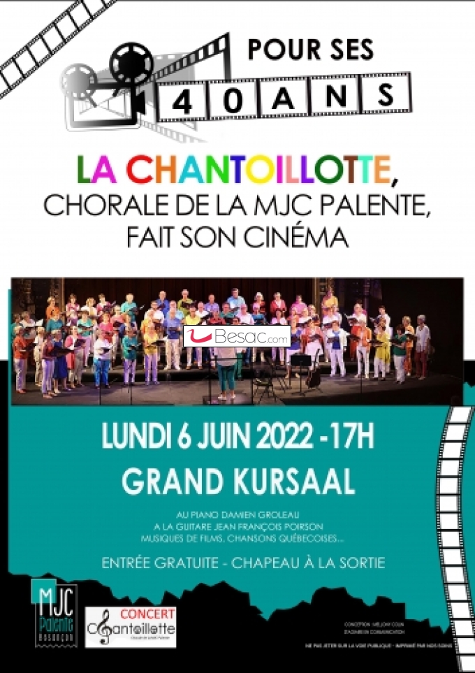 Lundi 6 juin à 17h, le grand Kursaal jouera les prolongations du Festival de Cannes. La Chorale de la MJC Palente, La Chantoillotte donnera un concert pour ses quarante ans d’existence.
