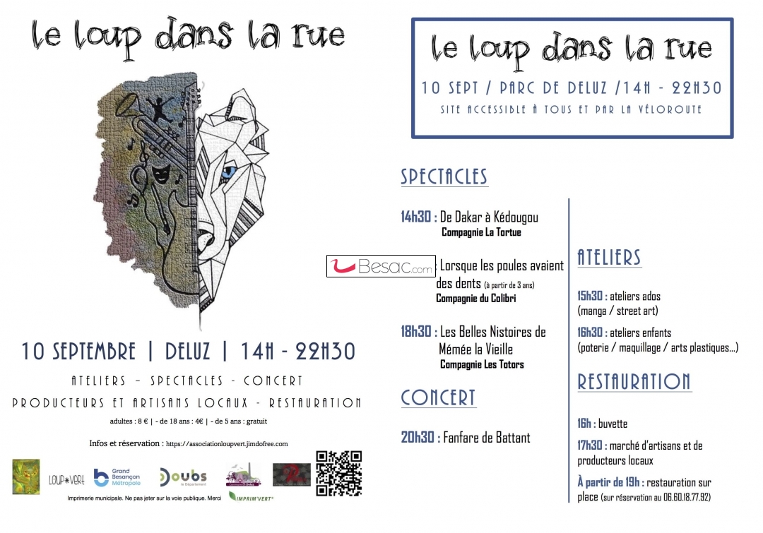 Spectacles, ThéâtreL’association Loup Vert organise son premier festival de rue le samedi 10 septembre 2022 entre 14h et 22h30 à Deluz dans le parc près de l’école et de l’église.