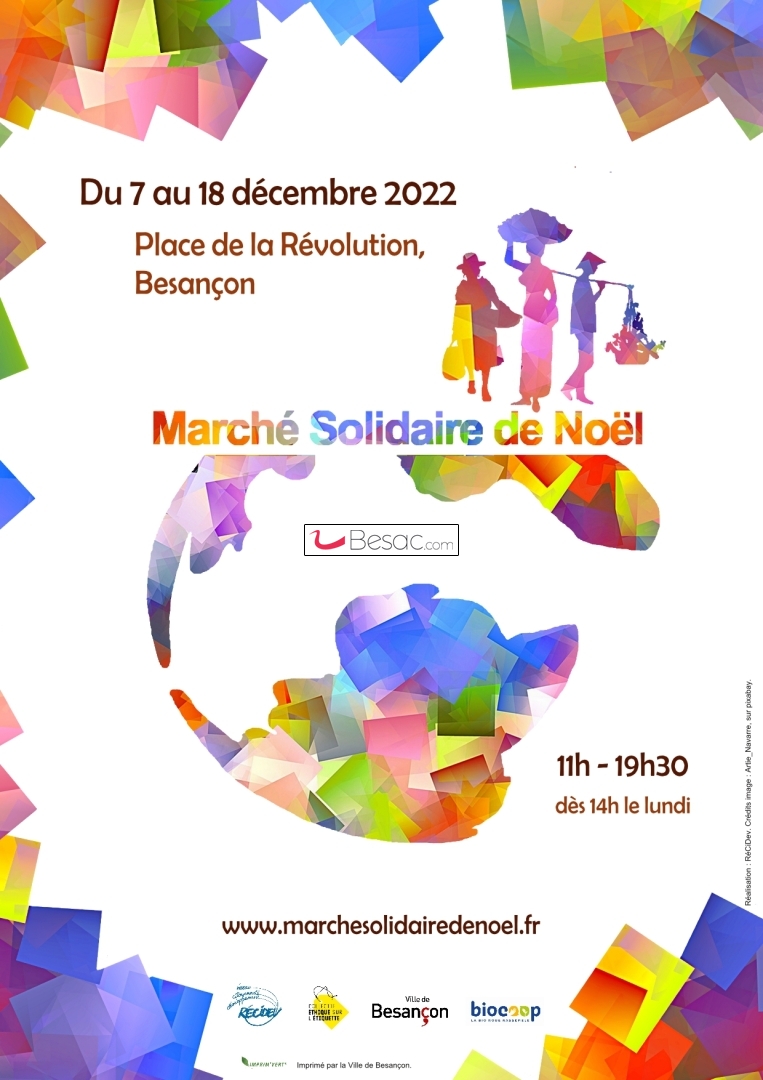 Marchés, Vide-greniersEn décembre 2022, les associations de solidarité internationale et locale vous accueilleront place Révolution pour un Noël sous le signe des cadeaux qui font sens. Du 7 au 18 décembre, rendez-vous au cœur du centre-ville de Besançon, sous un chapiteau chauffé et coloré pour découvrir une ambiance festive et solidaire.