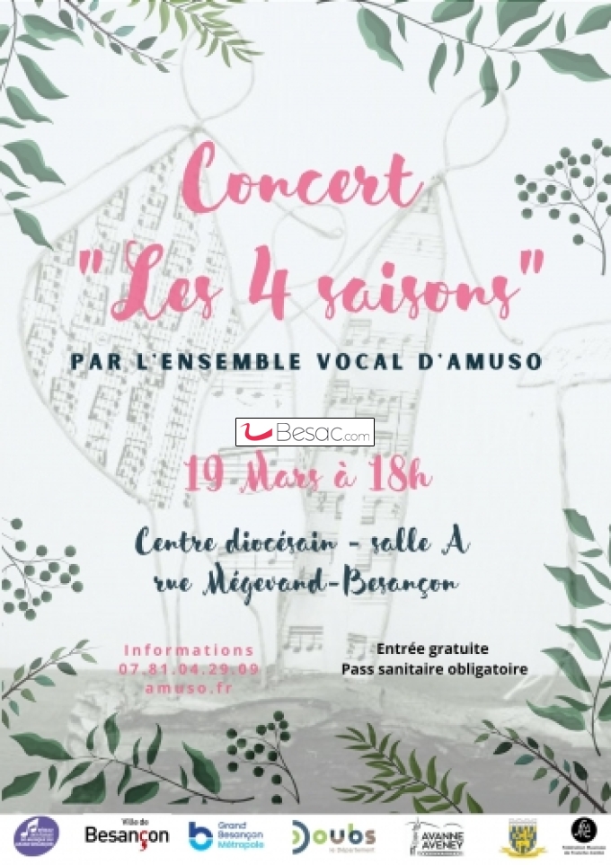 Musique, SoiréesL'ensemble vocal d'AMUSO vous propose un concert autour des 4 saisons . Du printemps à l'hiver , venez voyager avec des répertoire allant de la chanson française aux comédies musicales américaines .