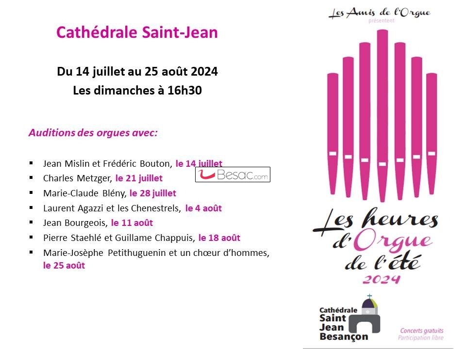 Musique, SoiréesEn partenariat avec l’équipe d’animation de la Cathédrale, les Amis de l’Orgue de Besançon vous proposent les Heures d’Orgue de l’été 2024, qui vous permettront d’entendre ou de réentendre les deux orgues de la cathédrale.