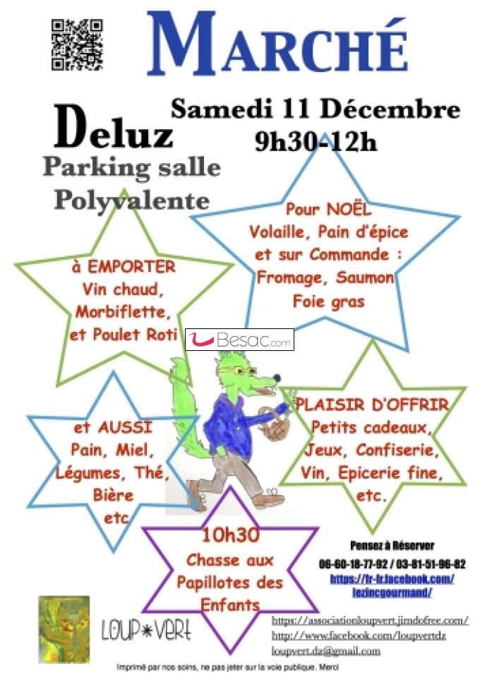 Marchés, Vide-greniersLe Marché de Deluz aura lieu le samedi 11 décembre, comme chaque deuxième samedi du mois, sur le parking de la salle polyvalente de Deluz. Vous y trouverez comme d’habitude Légumes, Pains, Thé, Bières etc… Mais aussi pour Noël des volailles, du pain d’épices et sur commande : Fromage, Saumon et Foie gras… Mais encore des idées cadeaux, vins, jeux, confiserie, épicerie fine… Et bien sûr à emporter : des Poulets rôtis, de la Morbiflette… et du Vin Chaud !