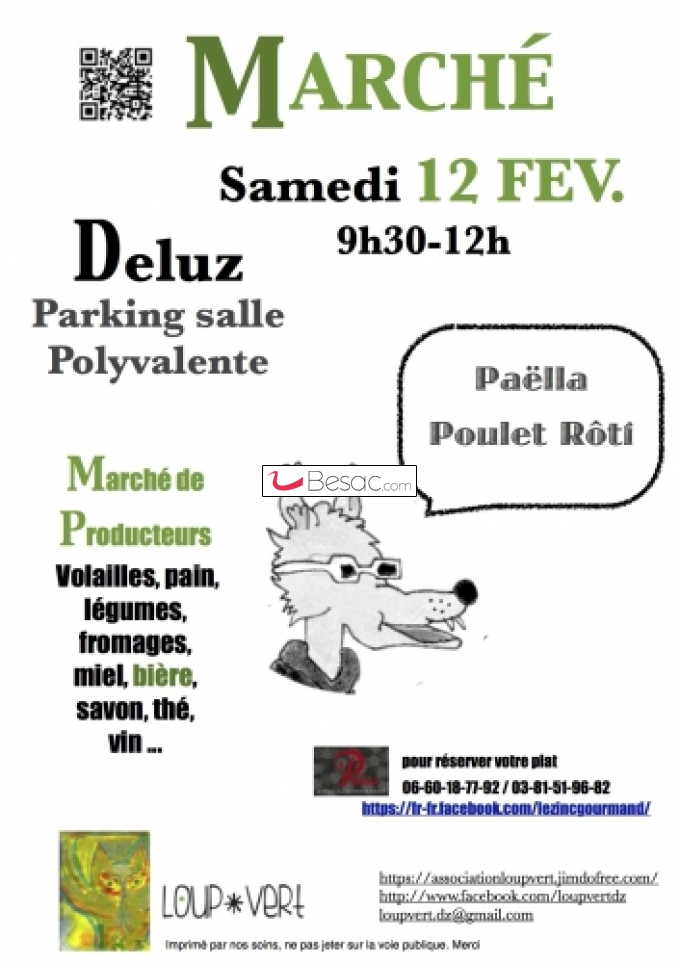 Marchés, Vide-greniersLe Marché de Deluz aura lieu le samedi 12 février, comme chaque deuxième samedi du mois, sur le parking de la salle polyvalente de Deluz. Vous y trouverez comme d’habitude Légumes, Pains, Volailles, Thé, Bières, Savons, Miel… Et bien sûr à emporter : des Poulets rôtis et de la Paëlla !