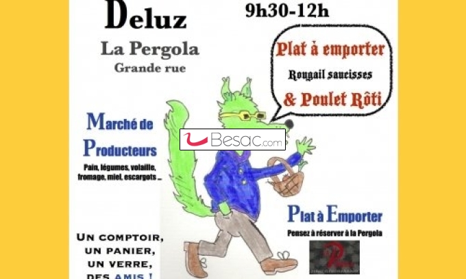 Marchés, Vide-greniersLe Marché de Deluz aura lieu le samedi 12 novembre, comme chaque deuxième samedi du mois, sur le parking de la salle polyvalente de Deluz. Vous y trouverez comme d’habitude Légumes, Pains, Volailles, Thé, Bières, Vins, Savons, Miel, Escargots… Et bien sûr à emporter : des Poulets rôtis et un plat préparé par La Pergola !
