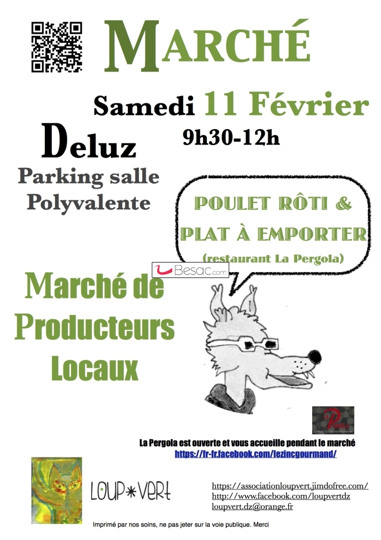 Marchés, Vide-greniersLe Marché de Deluz aura lieu le samedi 11 décembre, comme chaque deuxième samedi du mois, sur le parking de la salle polyvalente de Deluz. Vous y trouverez comme d’habitude Légumes, Pains, Thé, Bières etc… Mais aussi pour Noël des volailles, du pain d’épices et sur commande : Fromage, Saumon et Foie gras… Mais encore des idées cadeaux, vins, jeux, confiserie, épicerie fine… Et bien sûr à emporter : des Poulets rôtis, de la Morbiflette… et du Vin Chaud !