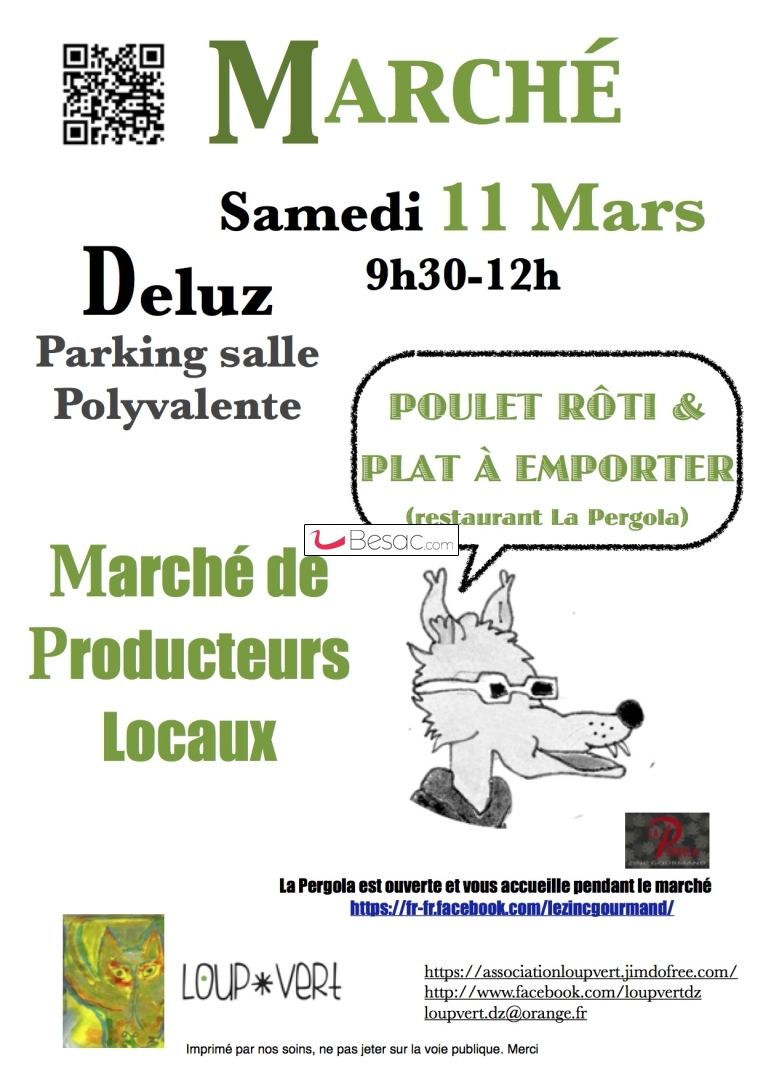 Marchés, Vide-greniersLe Marché de Deluz aura lieu le samedi 11 mars, comme chaque deuxième samedi du mois, sur le parking de la salle polyvalente de Deluz. Vous y trouverez comme d’habitude Légumes, Pains, Volailles, Thé, Bières, Vins, Savons, Miel, Escargots… Et bien sûr à emporter : des Poulets rôtis et un plat préparé par La Pergola !