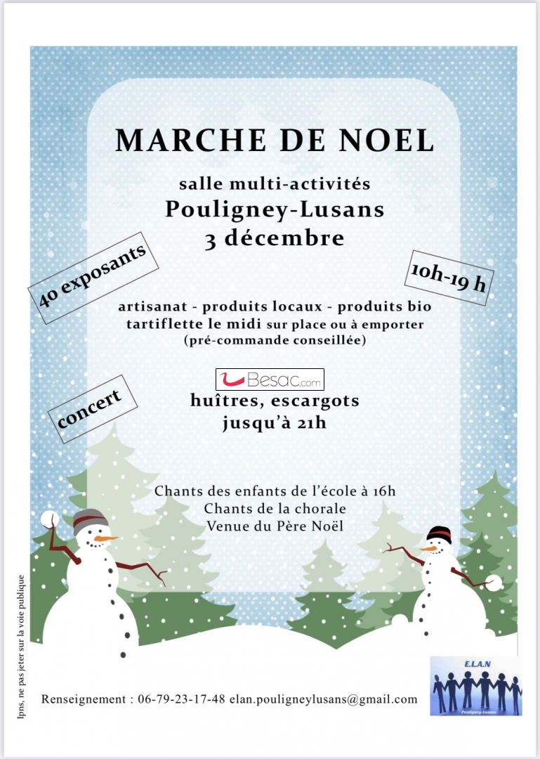 Marchés, Vide-greniersL’association ÉLAN de Pouligney-lusans organise sont 2e marché de Noël le samedi 03 décembre à la salle multi activités.