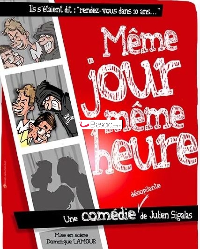 Ajoutez y de la nostalgie, de l'émotion, de l'amitié et beaucoup, beaucoup d'humour. Saupoudrez de chansons et d'une pincée de guitares. Pimentez le tout avec de l'(inter)action... Mélangez pendant une heure et quart. Vous obtiendrez "Même jour Même heure", une comédie chantante et désopilante. Attention ! Servir chaud...
