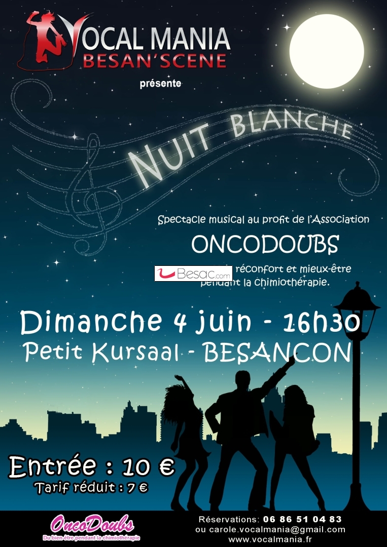 Au programme : un spectacle tout public qui vous emmène pour un voyage musical sur le thème de la Nuit. Des duos, des trios, une touche d’émotion, un zeste d’humour, quelques chorégraphies, des tableaux de groupe, une bonne dose de scénographie… tout ça pour vous faire passer un joli moment, et au profit d’une belle cause.