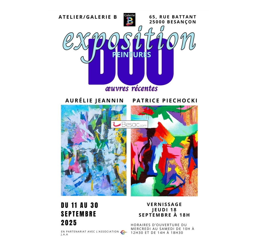 Cette exposition, placée sous le signe du "Positiv Art"vous ouvrira ses portes du 11 au 30 septembre à la galerie B, où seront réunis deux artistes peintres qui présentent leurs œuvres récentes : Patrice PIECHOCKI, dont la palette de couleurs éclatantes ne manquera pas de captiver votre regard, et Aurélie JEANNIN, dont les toiles vibrantes et lumineuses libèrent une belle énergie.