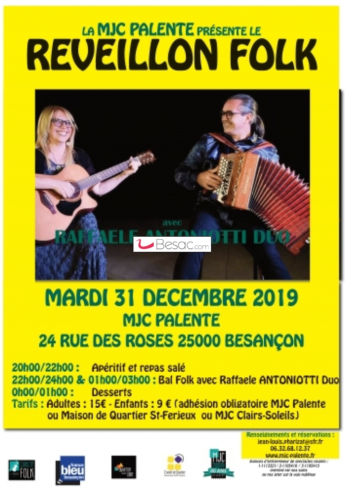 Musique, SoiréesRéveillon Folk avec Raffaele Antoniotti Duo, de 20h à 3h du matin à la salle Polyvalente de la MJC Palente.