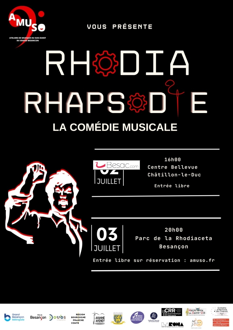Retrouvez Rhodia Rhapsodie la comédie musicale de l'école de musique AMUSO le 2 juillet à Châtillon le Duc et le 3 juillet à Besançon au parc de la Rhodiaceta.