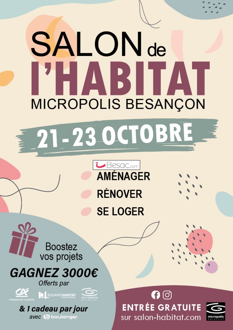 Salons, FoiresNous vous donnons rendez-vous au Salon de l'Habitat du 21 au 23 octobre 2022 à Micropolis Besançon pour rencontrer un grand nombre de professionnels qui pourront vous conseiller en immobilier, rénovation, agencement, ameublement et également vous guider concernant le financement de vos achats...