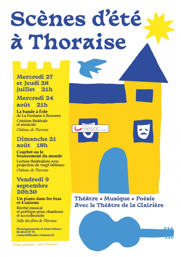 Les comédiens et musiciens du Théâtre de la Clairière jouent de la correspondance entre les fables de La Fontaine et les chansons de Georges Brassens avec le spectacle musical et théâtral "La Bande à Eole", dans la cour du château de Thoraise, les 27 et 28 juillet et 24 août à 21h. Mise en scène Pierre Louis.
