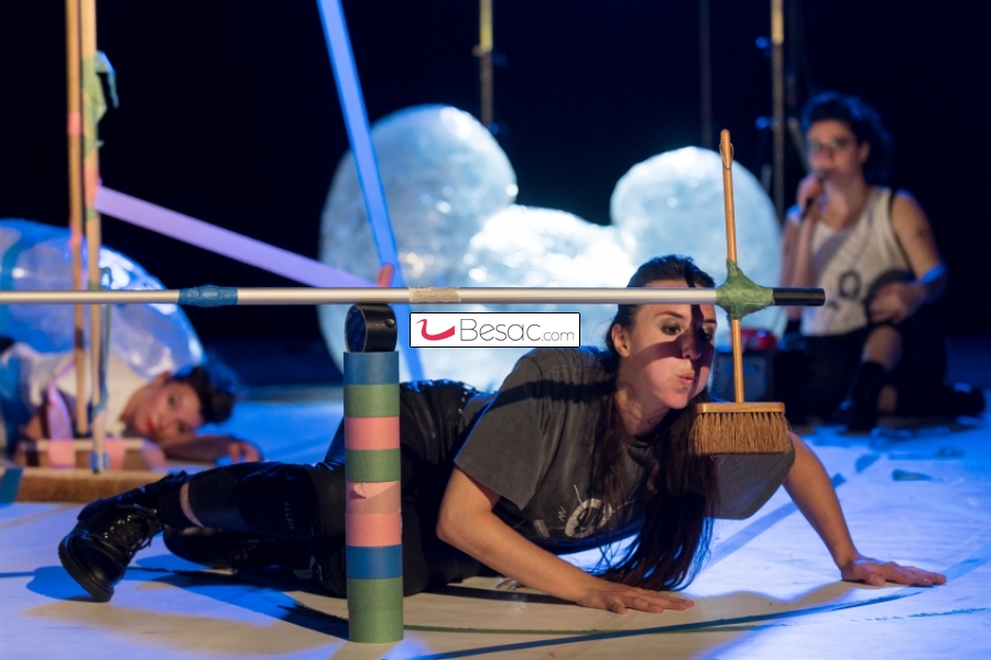 Comme son nom le laisse penser, ce spectacle mêle du mouvement, du son et… du scotch. À la fois danseuses, marionnettistes, comédiennes et compositrices, trois « animatrices de matière » s’amusent à explorer toutes les possibilités du ruban adhésif, en dévidant des rouleaux entiers entre elles, nous et l’espace. Improvisant avec l’imprévisibilité de cette matière collante, leur chorégraphie les embarque dans des constructions dont on se demande comment elles font pour tenir, voire si elles vont tenir. Une expérience haletante qui mêle joyeusement les énergies du rock et du catch, et à laquelle on ne peut qu’adhérer.