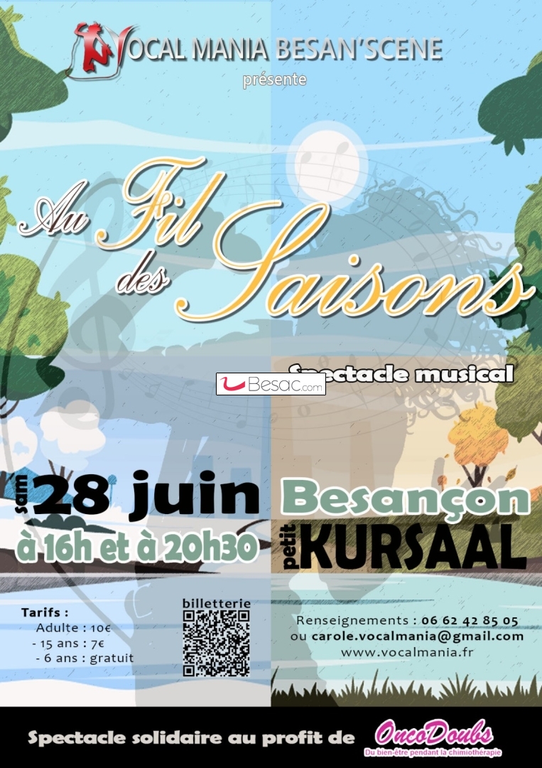 Les élèves de l'école de chant Vocal Mania présentent "Au fil des saisons", un spectacle musical tout public, qui vous emmène revisiter en chansons les quatre saisons... Tous les bénéfices sont reversés à l'association OncoDoubs, qui oeuvre au quotidien auprès des personnes atteintes de cancer.