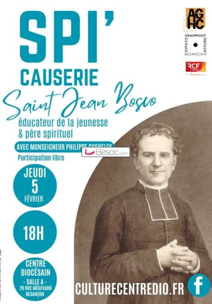 Dans le cadre des « Spi’causeries » qui ont lieu toute l’année au Centre diocésain de Besançon, Monseigneur Philippe Gueneley nous propose une conférence sur le « Saint Jean Bosco », jeudi 5 février à 18h, en salle C4 du Centre diocésain de Besançon, 20 rue Mégevand.