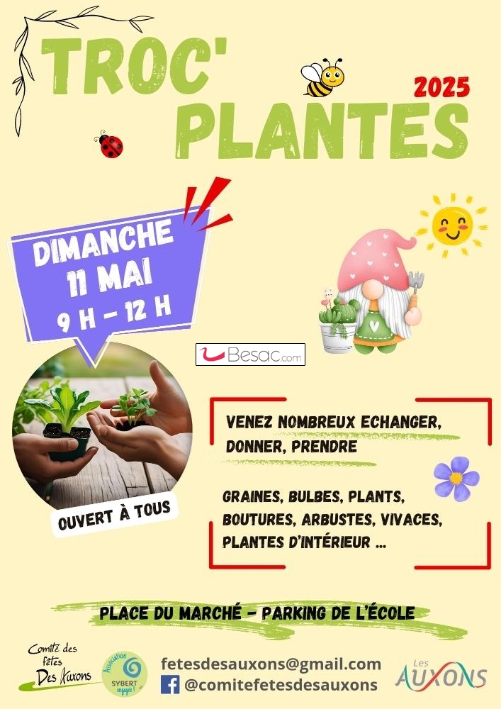 Culture, NatureLe comité des fêtes des Auxons vous invite à son troc-plantes annuel : venez nombreux échanger, donner, prendre des graines, bulbes, plants, boutures, arbustes, etc...
