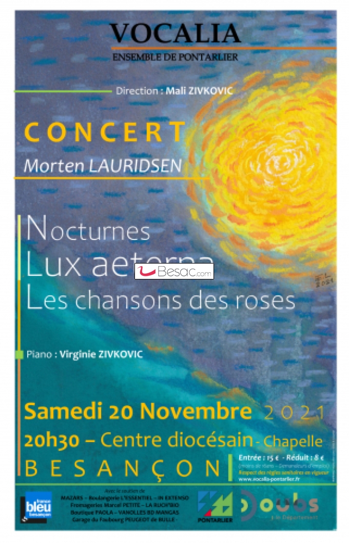 Musique, SoiréesSi vous vous souvenez du générique de "Anges et démons" de Ron Howards, sans doute serez vous de le redécouvrir en live. En effet, cette année, l'ensemble vocal Vocalia vous présentera un répertoire de Morten Lauridsen, un compositeur américain d'origine danoise qui vous enchantera.